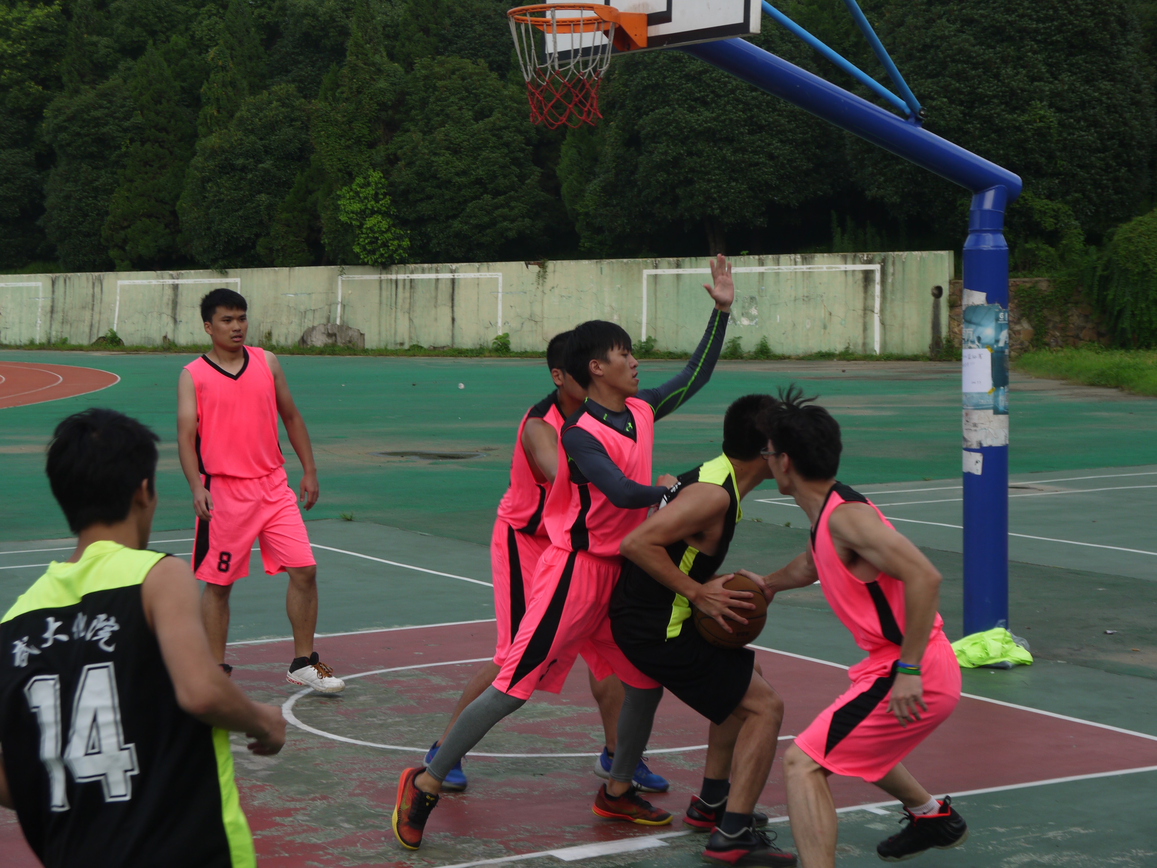 第一比赛日,天气酷热难耐,却也阻挡不了队员们的热情,参赛的四支队伍穿着整齐的队服,精神焕发,斗志昂扬,顶着烈日,奔跑在球场,挥洒着汗水,为大家带来了两场精彩的比赛,赢得了观战同学们的阵阵喝彩。该比赛日赛事异常激烈,物化分析老将队与研一小鲜肉对旗鼓相当,比赛异常胶着,一直打到第二个加时赛,最终小鲜肉们还是经验不足难敌老将队,以一分之差惜败。第一比赛日是篮球赛的美好开局。老天似乎对毕业生的离去十分不舍,在接下来的几天时间里一直淅淅沥沥的下着雨,比赛在晴雨间隙中艰难地进行着。