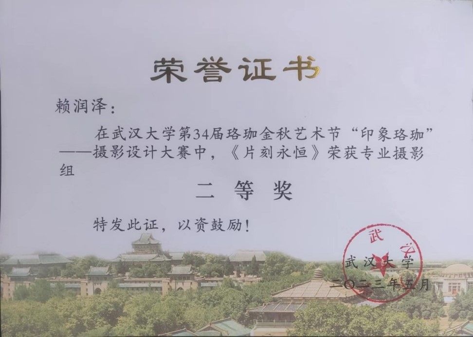 首先真的很荣幸能获得这次金秋摄影设计大赛的二等奖,非常感谢各位支持我、帮助我、给我投票的老师与同学们,身为一个刚入门的小白,能拿奖真的非常荣幸,我也会不断努力提升自己的技术力。