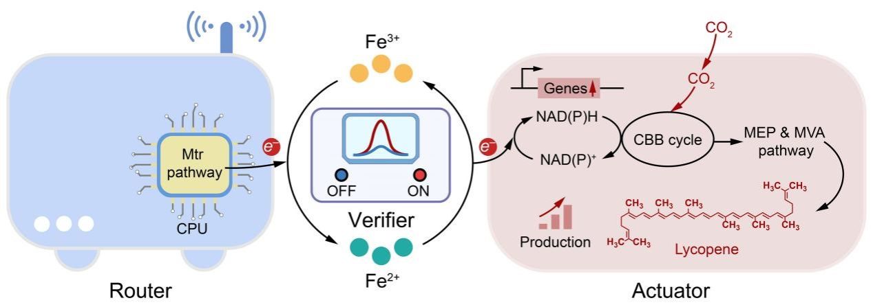 本研究中,作者基于微生物体系电子传递引发的Fe3+/Fe2+信号转化,建立了一个包含希瓦氏菌“路由器”、光学纳米探针“验证器”以及沼泽红细菌“致动器”的微生物循环通信网络模型,通过对体系中氧化还原动态信息的感知、分析和处理,实现微生物代谢过程的动态调控,提升微生物合成高效附加值产物的效率。通过对该模型分析研究,作者发现这种基于电子传递的氧化还原网络可促进微生物体系中相关电子传递蛋白高表达,通过氧化还原状态的动态可逆切换为沼泽红“致动器”源源不断的定向运输电子流,提高沼泽红细菌“致动器”中关键还原性分子包括NADPH、NADH的含量,进而影响微生物代谢。研究结果表明,这种基于电子传递的氧化还原网络可实现微生物代谢调控,协调双菌体系及三菌体系中细菌的代谢行为,有效提升了沼泽红细菌“致动器”生物合成效率以及CO2固定效率。此研究提出的基于电子传递的氧化还原通信的代谢调节策略有望为生物合成、碳中和等领域提供一种新的可能的思路和方法。